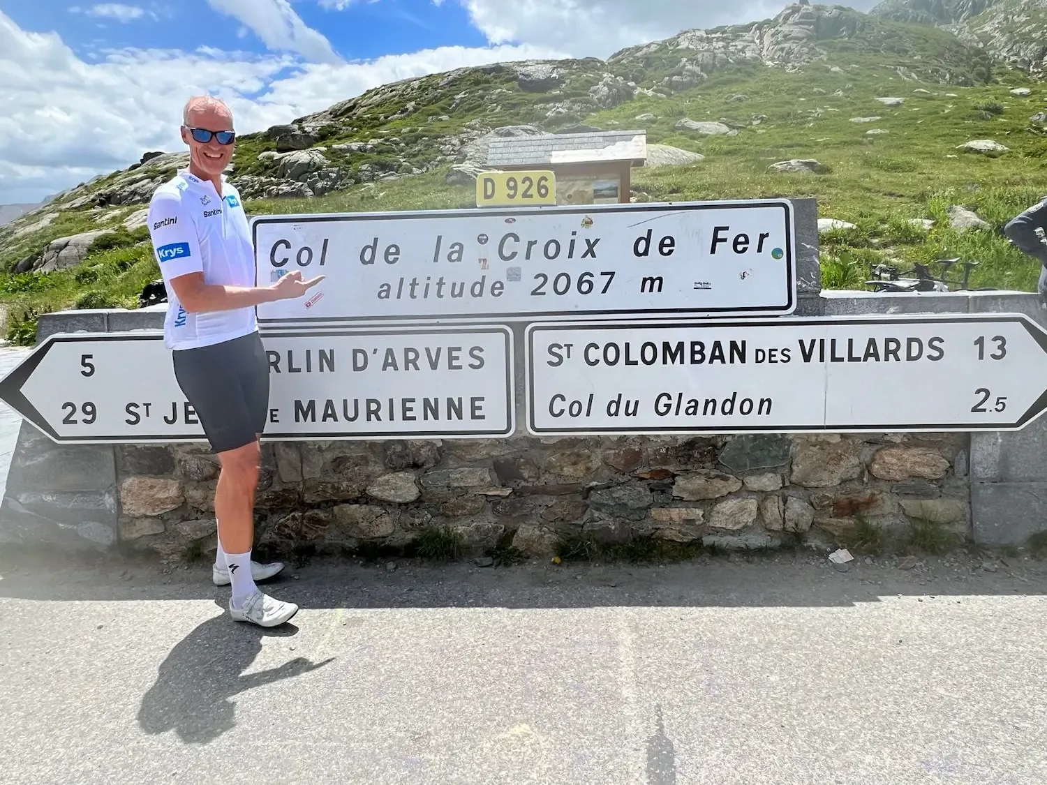 The link across to the Col de la Croix de Fer is only a couple of kilometres but it's the bit I'll remember longest. Emerald grass, grazing cows, and the serrated Aiguilles d'Arves stacked on the horizon like broken teeth. The stone signpost at the Croix de Fer summit (2,067 m) points toward Saint-Colomban-des-Villards and Saint-Jean-de-Maurienne, and the iron cross itself sits a few metres away, looking exactly like it does on TV. The buvette was doing brisk trade: coffee, Coke, and a slice of tarte aux myrtilles.