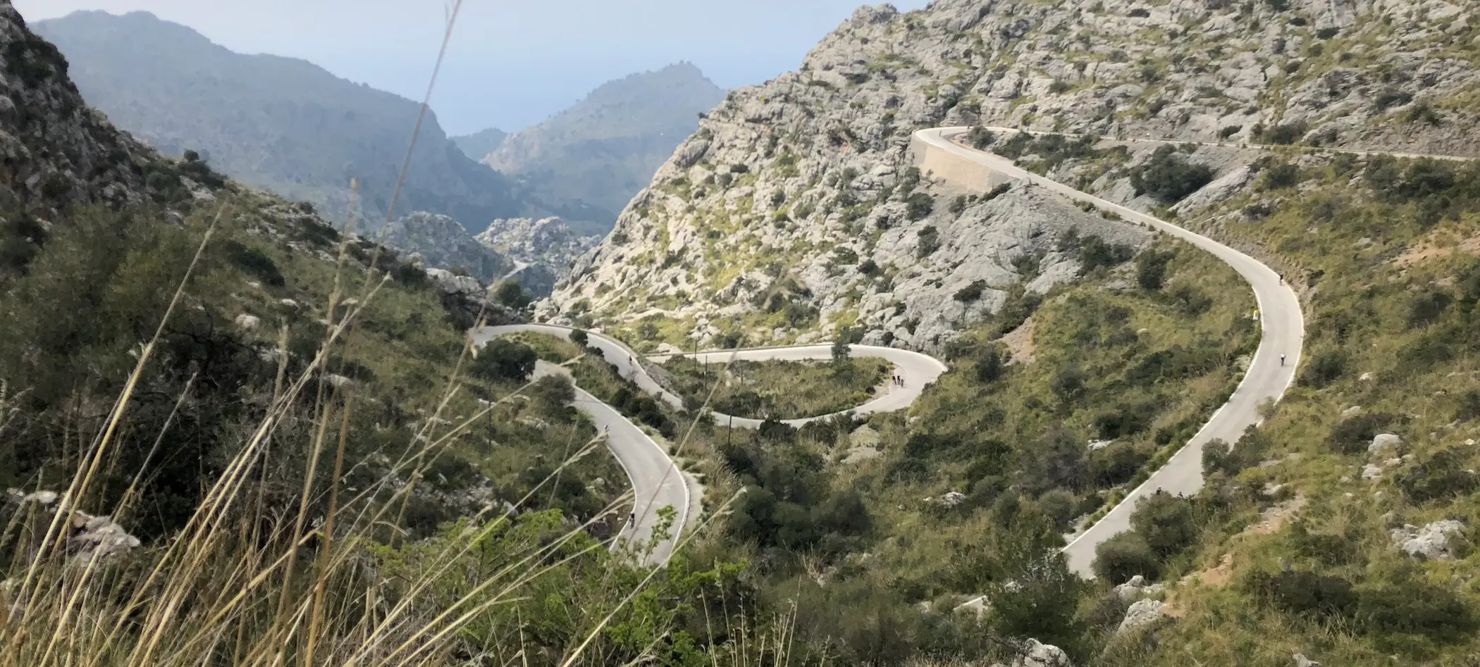 Das ist die Schleife, um die jede ernsthafte Mallorca-Woche kreist. Ich bin sie mehr als einmal gefahren, und was mir jedes Mal auffällt, ist, wie der Tag sich in Kapitel teilt. Sa Batalla ist das Aufwärmen — lang genug, um zu zählen, regelmäßig genug, dass du den Rhythmus findest, ohne darüber nachzudenken. Die Terrassen-Stelle früh im Anstieg, wo die Straße so eng übereinanderstapelt, dass du nach unten schauen und Radfahrer hinter dir wie auf Stufen siehst, kriegt mich jedes Mal.
