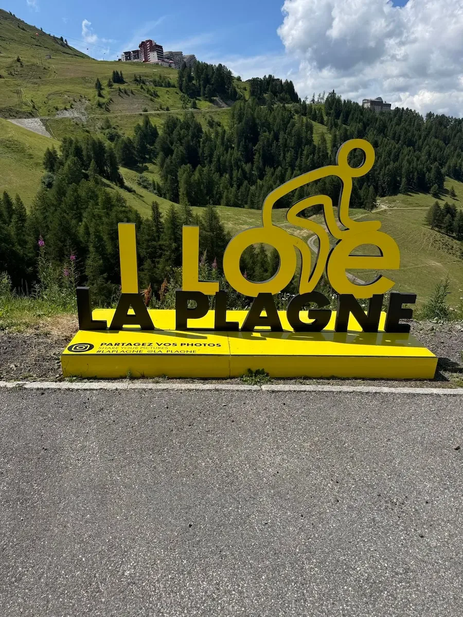 The last push into Plagne Centre opens out into alpine meadow and larch, wildflowers along the verge, and then the ski-station concrete of the resort itself. The hairpin at Plagne Aime 2000 is decorated with polka-dot and yellow jersey façades on the Salle Omnisports Pierre Leroux — absurd, joyful, very French. I stopped at the big yellow I ❤ LA PLAGNE cyclist sculpture for the obligatory photo, then wandered over to the brasserie for a Coke and a slice of tarte aux myrtilles while my legs stopped shaking.