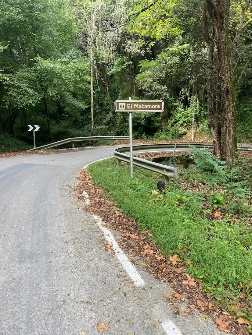 Through Canet d'Adri the character shifts. The pavement narrows, oak woodland closes in, and little hamlets tick by. You can feel the climb waiting. The brown El Matamors sign at a shaded hairpin is the unofficial start gun — from here it's proper Rocacorba, the same pitches that Pogačar, Van Vleuten and half the Girona pro scene use as their benchmark. Tough, but a fantastic climb.