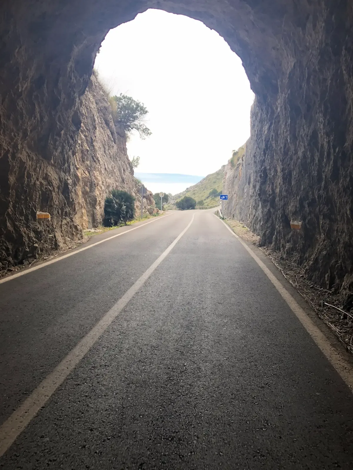 Past the mirador the peninsula becomes a spine of short stingers and fast descents. Rock arches have been cut straight through the limestone — one in particular, the cinematic tunnel-arch, is the signature frame of the ride. You ride out of shadow into sky and the road keeps twisting. There's no rhythm to settle into; it's a conversation with the terrain the whole way out.